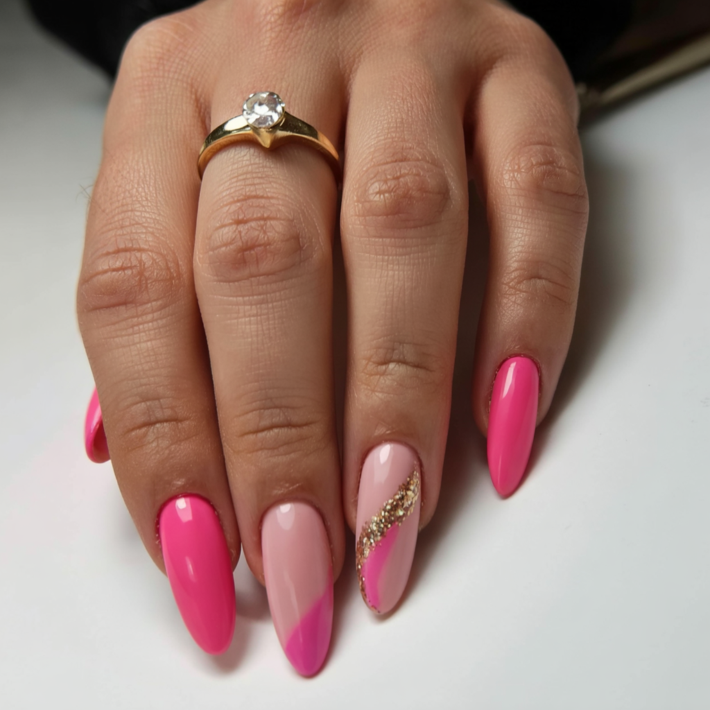 This glossy blush and pink almond set offers elegance yet is surprisingly rich in sparkling details. The golden glitter swirl on an accent nail brings a delicate shimmer suitable for dinner parties, weddings and summer events. The design shows how simple gel nails definitely shine when paired with effectively placed sparkles. Such minimalist designs suit the nature of someone who loves her shining moments.