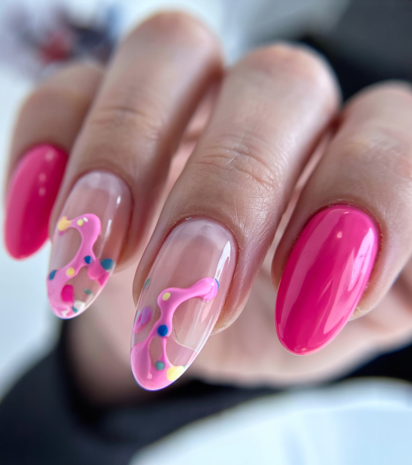For a modern, bold twist, this circular motif is the perfect choice. A natural nail base with neon pink and abstract squiggles and multicolored dots creates this eye-catching gel design that appeals to people who enjoy artistic expression. Because of its summer festival and fun night out appeal and creative energy the combo represents. This design represents the perfect combination of minimalist basic elements with maximalist artistic components, establishing itself as a phenomenal aesthetic trend for 2025.