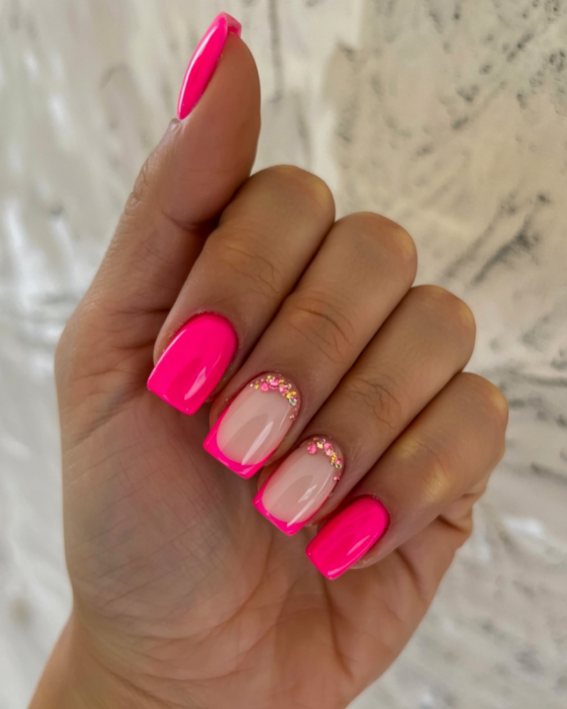 The square gel design presented in this contemporary French Tip evolution utilizes neon pink color and glittering bling around the cuticle area. The nude and neon colors combine to create a luxurious and playful experience through their watery contrast. This product combines a venerable format with futuristic elements of 2025 to create the perfect evolution.