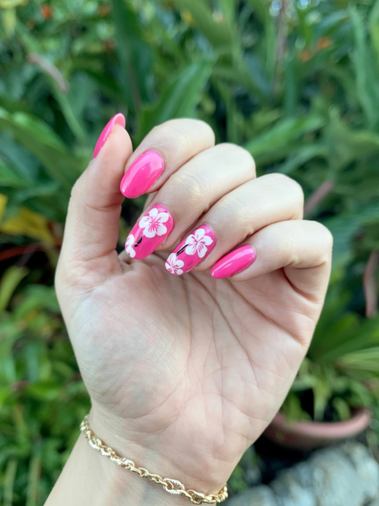 A nail style of flowers on a glossy pink background is the perfect look to show your relaxed vacation state. This oval manicure creates instant island charm with white hibiscus-shaped flowers that stand out against the colorful background. Use this set for colorful beach adventures as it provides party-ready nails without being too extravagant. The combination of lightweight clothing and gold accessories creates a unified summer aesthetic when worn with this manicure.