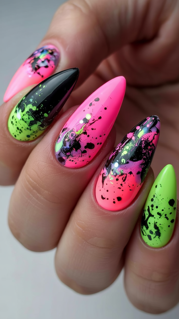 This almond-shaped design is an edgy statement piece that combines almond, black and lime with neon pink to create a splattered paint effect. The abstract art-inspired design integrates raw power together with rebellious energy to create this perfect style. The design is perfect for summer appearances paired with bold clothing that creates an eye-catching effect. The choice of nails coated with a sparkling finish enhances its electric appeal.