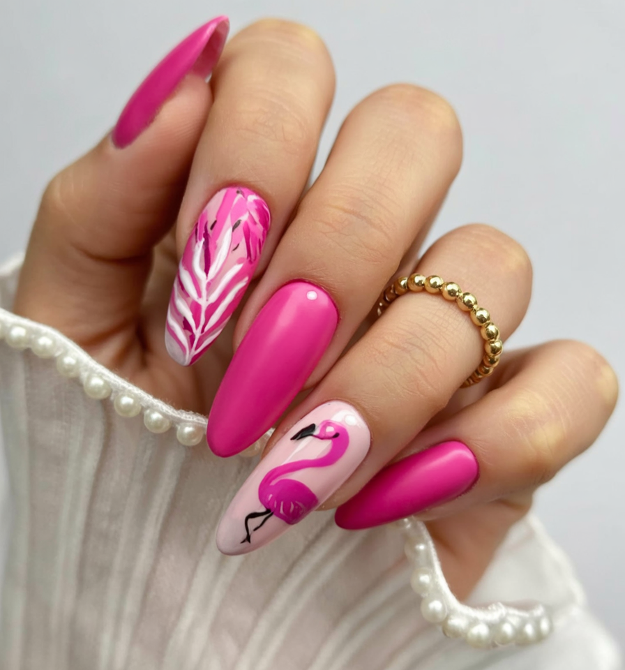 The hand-painted flamingo creation with leaf detail is a cute and playful tribute to tropical wildlife in this nail set that combines deep pinks. A soft almond nail shape adds sophistication to the otherwise fanciful look. This design stands out among its peers because it appeals to trendsetters who combine sun-drenched style with fashion-forward concepts.