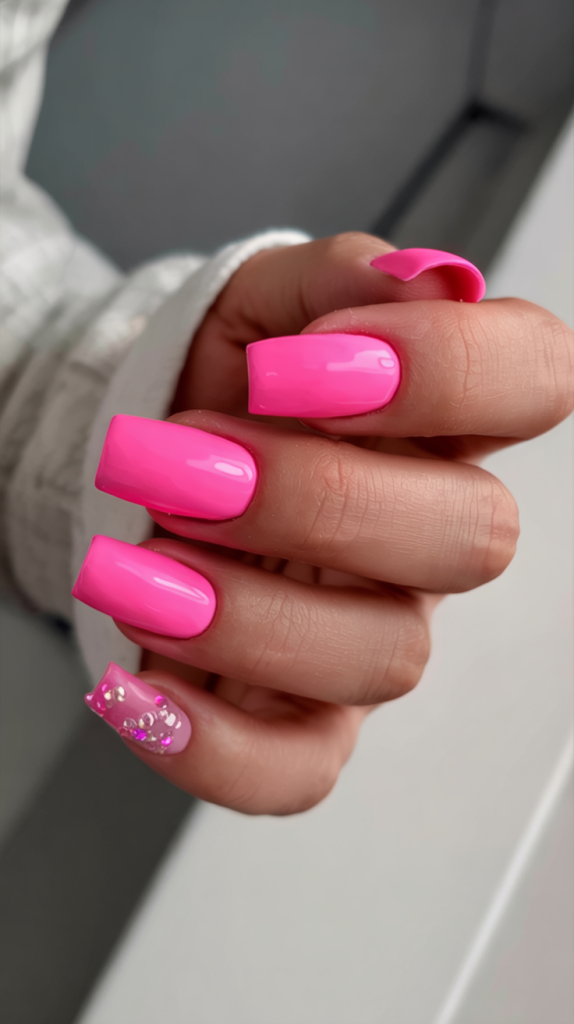 People who prefer simple elegance will love the reflective look of this square manicure design. A sleek set of neon pink gel nails dominate the fingers along with the accent nail that features both soft glitter and attention-grabbing bling. At ease with any look from casual office events to elegant evening affairs, this design works perfectly across day to night outfits on individuals with golden tans.
