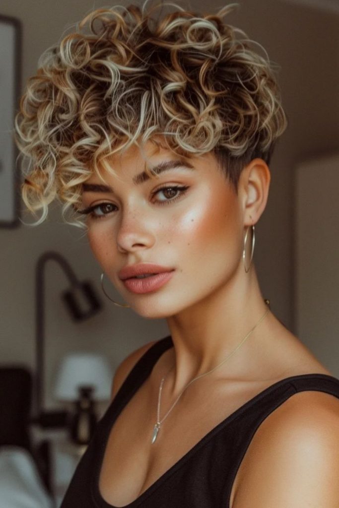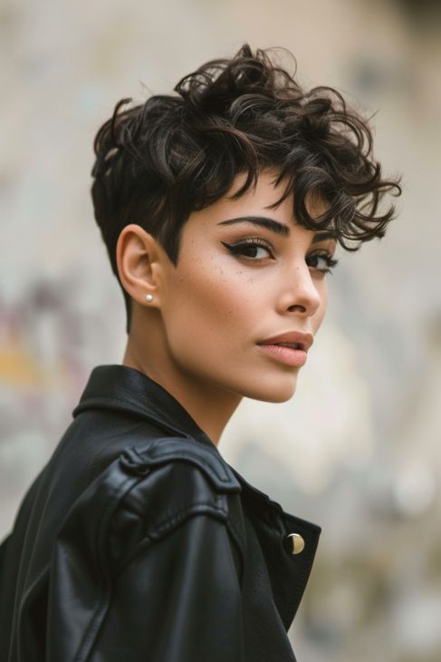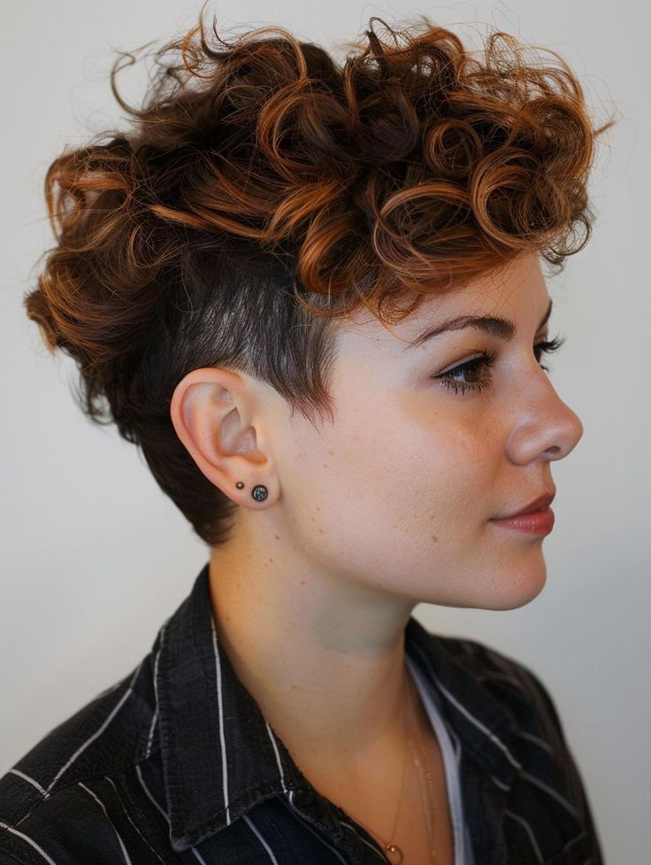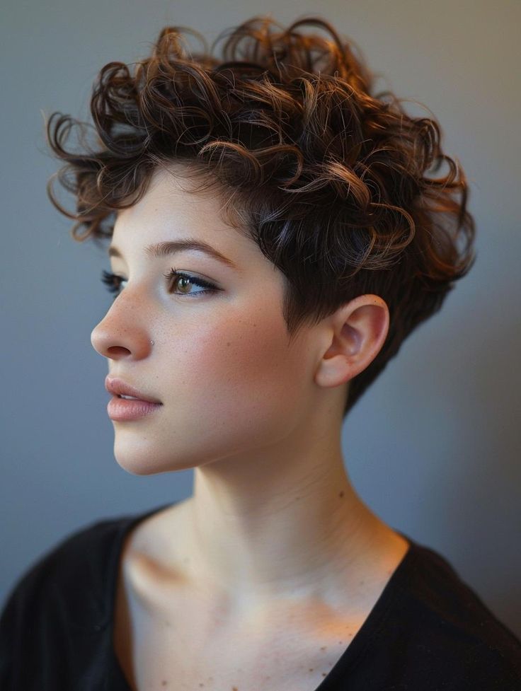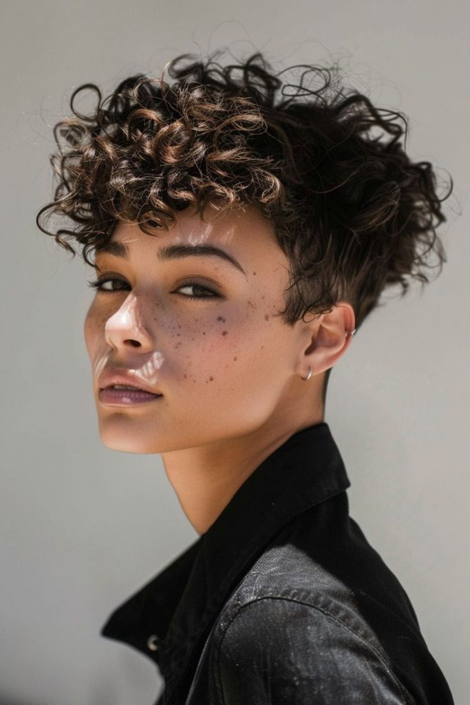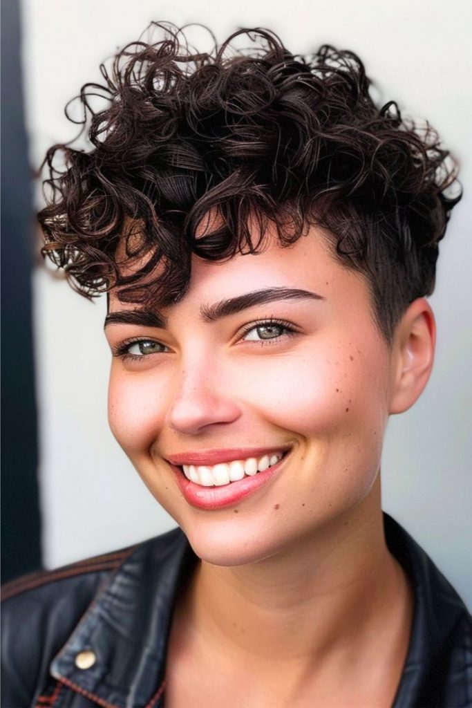This pixie cut is a bold statement with its textured top and shaved sides, suitable for those with a heart face. The edgy design adds a modern flair, while the curls soften the overall look.