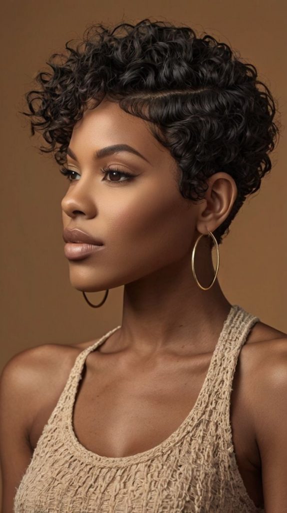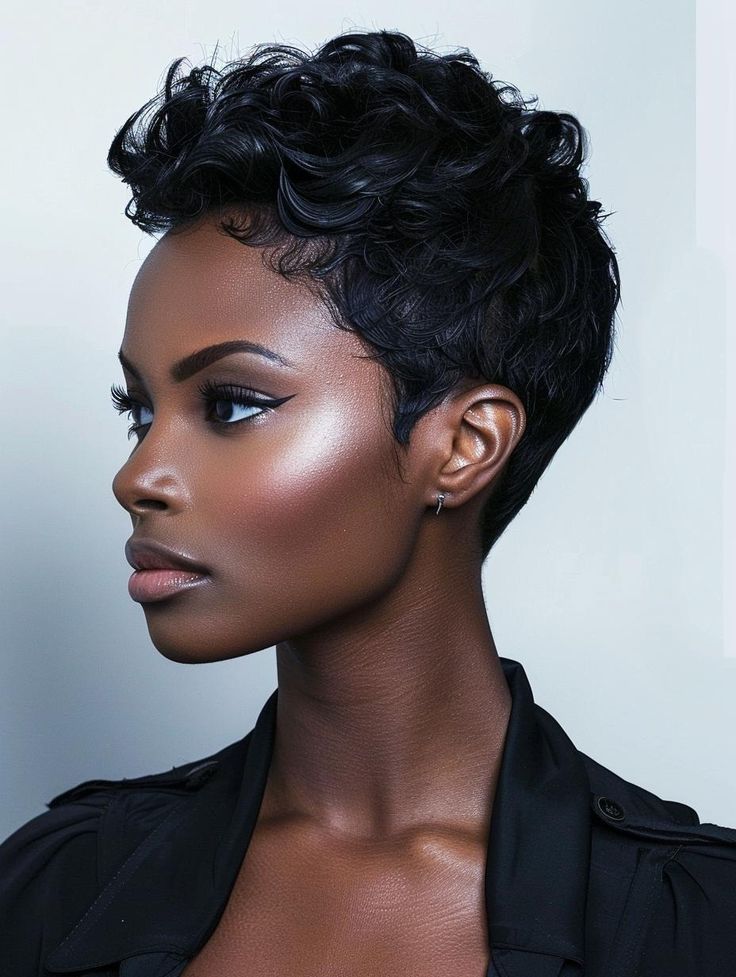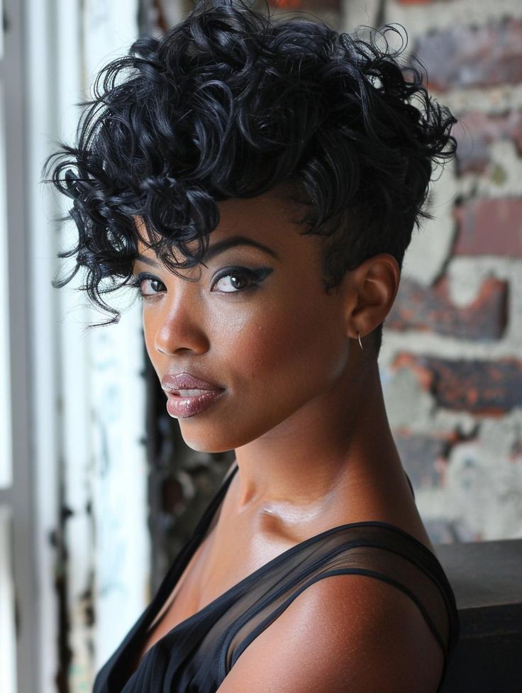 This dramatic pixie features jet-black curls with a voluminous side sweep, ideal for black women or those with long face shapes. The deep side part and structured layers add a glamorous touch, perfect for evening events or formal settings.