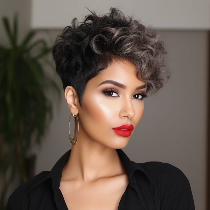This tousled pixie cut embraces a carefree spirit with loose, playful curls. Perfect for oval face hairstyles short, the light highlights add dimension and depth, making it an excellent choice for casual and semi-formal settings.