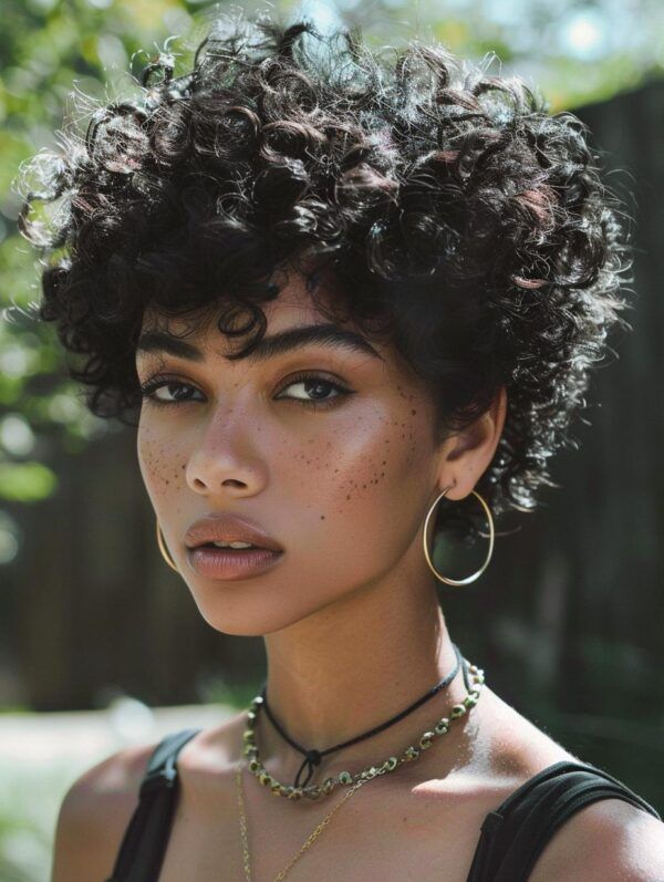Designed with black women in mind, this look celebrates natural tight coils with a cropped finish. The neat edges and controlled volume elevate this style, offering a clean yet trendy aesthetic. It works wonderfully for round face 3c curls, ensuring effortless manageability and style.
