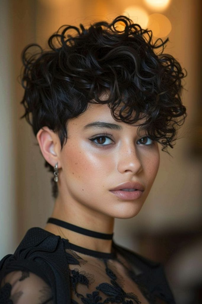 This edgy pixie cut features asymmetry and dark curls for a bold, contemporary twist. Perfect for an oval face hairstyle short, the angled design draws attention to the eyes and cheekbones, making it a great option for women seeking something modern yet wearable.