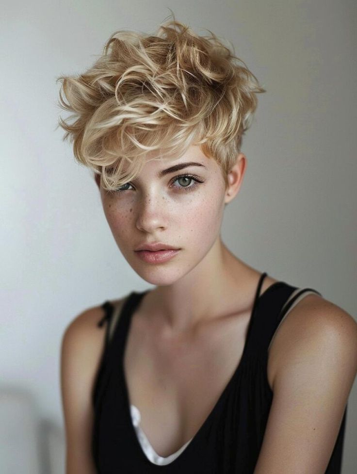 This pixie cut features tousled, blonde curls that exude effortless charm. The layers create natural volume, making it ideal for those with a round face or a chubby face. The soft texture softens angular features and enhances natural beauty, perfect for both casual brunches and professional settings.