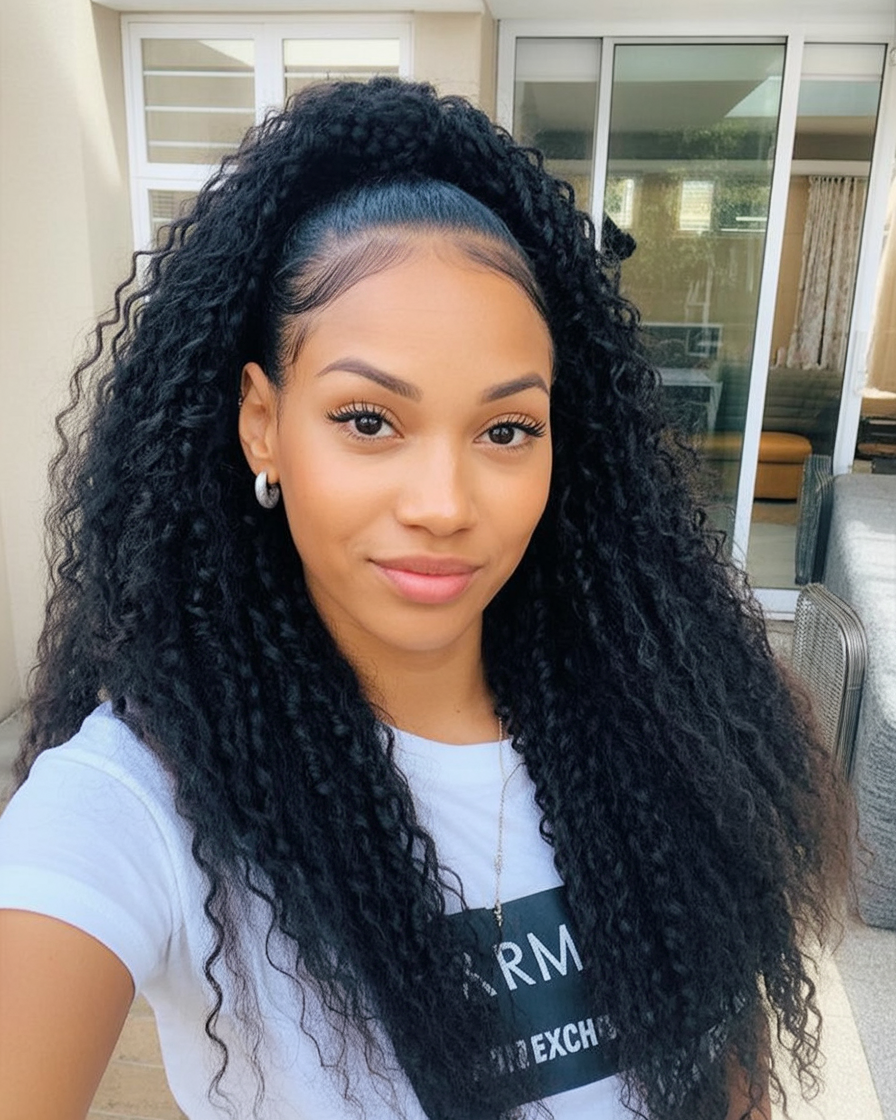 There’s something irresistible about a half-up ponytail that lets curls do all the talking. This version gathers the top into a confident puff while the rest cascades in voluminous coils—joyful, playful, and unapologetically big-hair energy. It frames the face softly and gives just enough lift to feel intentional without sacrificing your natural hair texture. Styling tips or care instructions: Define curls first with a leave-in and gel, then stretch or diffuse to your preferred shape. Use a soft, snag-free tie and an edge brush with a touch of pomade for a clean hairline. Refresh on day two with a water-based spritz. For Black women who love curly styles that read “cute” yet “put-together,” this is an easy go-to that shines at brunch, for school pickups, or for a casual date night.