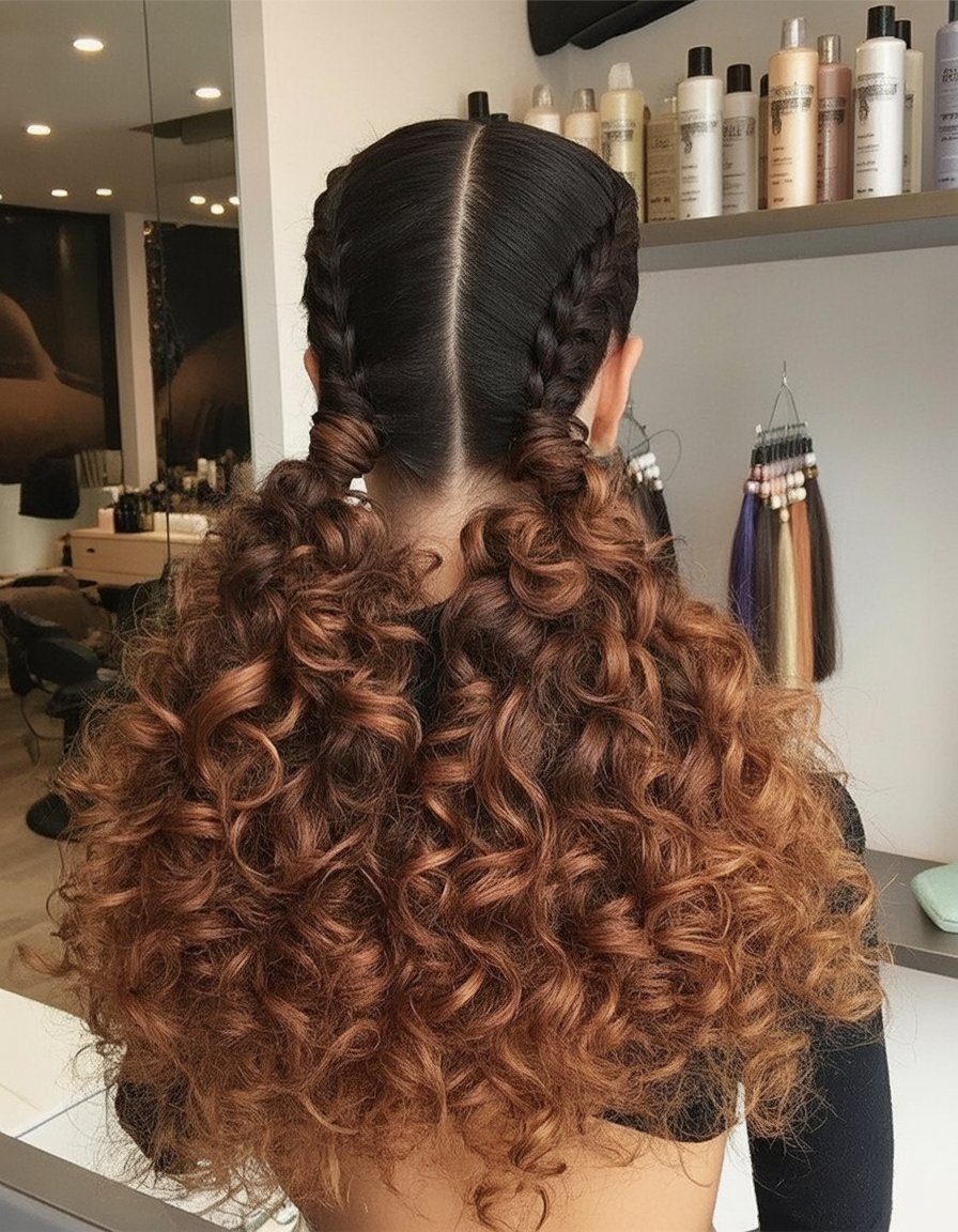 Two sleek scalp braids feeding into bouncy pigtail ponies? Pure joy. The look is playful yet deliberate, spotlighting definition and color variation in curly ends. It’s equal parts sporty and chic—great for a weekend outing, a casual party, or when you simply want your curls to take center stage while the top stays neat. Low-maintenance angle: once braided, this style lasts for days with minimal touch-ups. Perfect for natural hair or anyone who wants an easy routine. Seal curls with a cream-gel cocktail, tie with satin scrunchies to avoid dents, and sleep in a bonnet. It’s cute, practical, and keeps tangles at bay—an easy win for busy mornings or for kids who love movement.