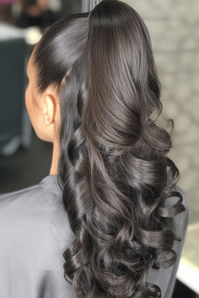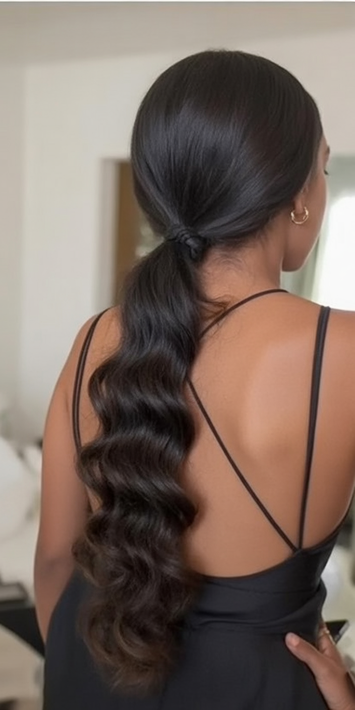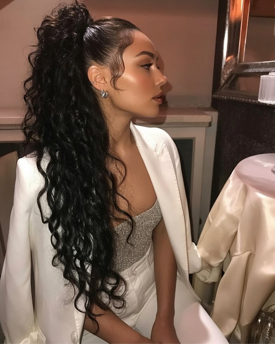 Old Hollywood glamour meets modern ease in this ponytail with sculpted, glossy waves. The crown is sleek and lifted; the tail flows in luxe, uniform S-curves that feel timeless and red-carpet ready. It’s the kind of style that makes even a simple black dress look couture. The vibe or attitude it gives off: confident, elegant, and a touch dramatic—without heaviness. Works best on long hair or extensions; set the tail with a large iron and clip each curl to cool, then brush into waves with a boar-bristle brush. A side part can read more formal, while a center part feels editorial. Finish with shine spray and a strong but flexible hold.