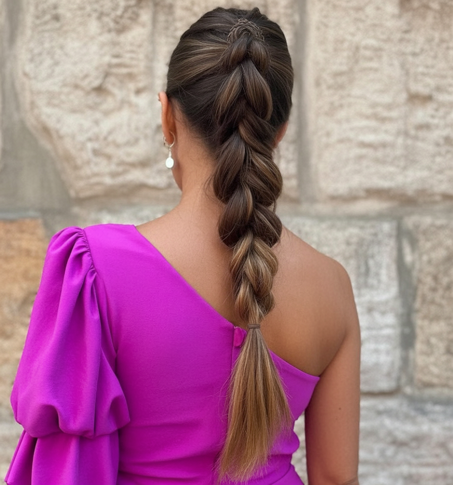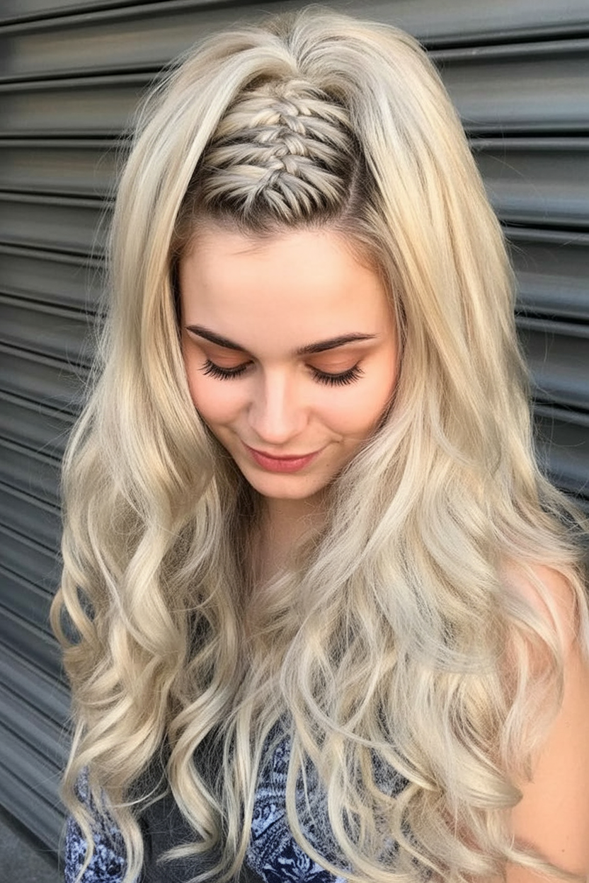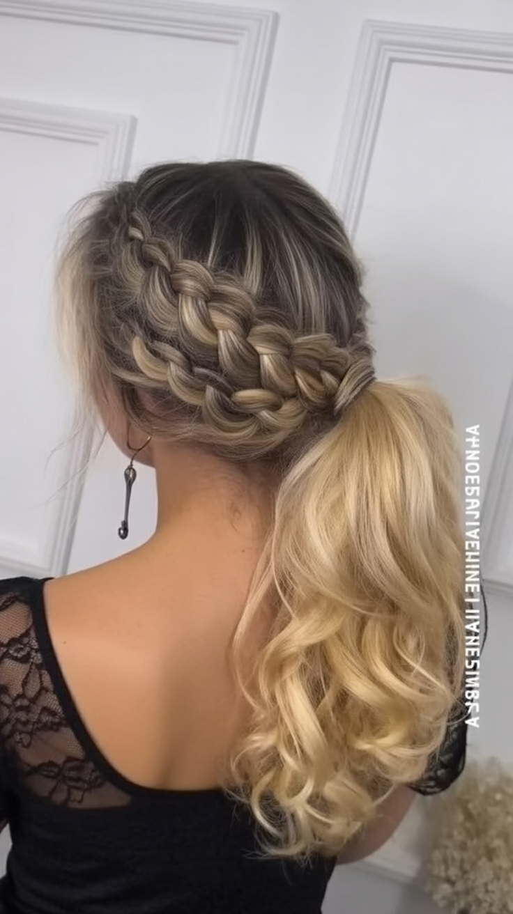 This style braids the top center like a chic runway detail, then sweeps everything into a high ponytail—a crisp mix of texture and lift. The braid adds structure up front so the rest can stay airy and relaxed. It feels youthful without reading juvenile, and it photographs beautifully from every angle. Comparison with other styles: unlike a basic high pony, the front braid gives built-in grip and height, making it great for fine hair that slips. It’s also more breathable than a full updo. Try it for a wedding guest look or any formal moment when you want polish without fuss. Prep with texturizing spray, braid the center panel, secure the pony, and then curl the ends for soft movement.