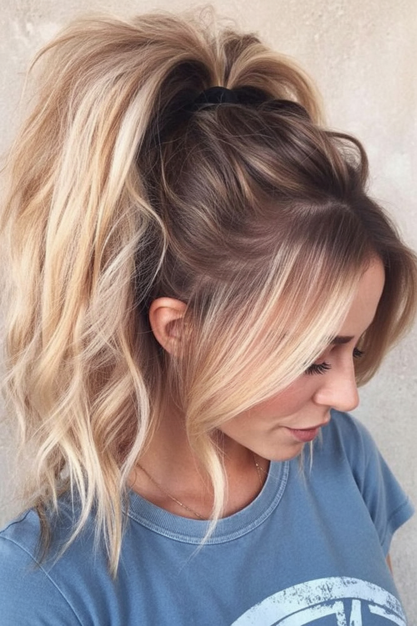 This lived-in, slightly messy mid-height pony is all about effortless charm. Face-brightening highlights peek out from loose pieces, while the tail has airy bends that feel weekend-casual and beautifully undone. It’s the pony that says you’re relaxed, fun, and still pulled together—perfect for coffee runs, for school events, or for a spontaneous patio dinner. Motivation to try it now: it’s easy, forgiving, and loves second-day texture. Spray dry shampoo at the roots, gather loosely, and tug a few strands free near the temples. Scrunch the tail with a light mousse for movement. If your hair is short to medium, a fake clip-in pony adds instant fullness. It’s simple, quick, and reliably cute—your new everyday favorite.