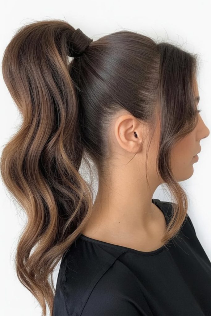 Warm caramel ribbons glow against a dark base, and the ponytail itself sits high and perky—youthful without feeling girlish. Soft layers fall forward to skim the jawline, giving a flattering frame and a little flirt. It’s polished enough for the office, cute enough for drinks, and reads luxe in photographs. Current trends (2026): color blocking and face-framing lights are big, and this pony shows them off. Works on straight or wavy hair; curl ends with a medium barrel and brush out for bounce. If your hair is medium density, add a small clip-in for volume. A simple wrap of hair around the elastic finishes the look in seconds.