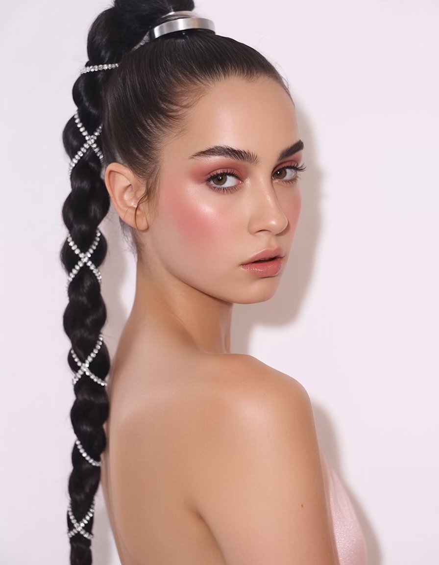This ponytail weaves elegance and edge: a high, tight base feeds into a single rope braid laced with delicate crystals. It’s a head-turner without shouting, catching the light as you move—think red-carpet energy on a Tuesday. The sleek base lifts the face, and the braid keeps the length neat and photogenic all day. What to wear it with: pair with clean shoulders, luminous skin, and simple hoops so the braid can sparkle. Gorgeous for wedding guests, a bridal shower, or any fancy occasion where you want polish with personality. Works for straight or curly textures once smoothed at the base; add a little wax for grip, braid firmly, and thread a crystal cord along the plait for shine.