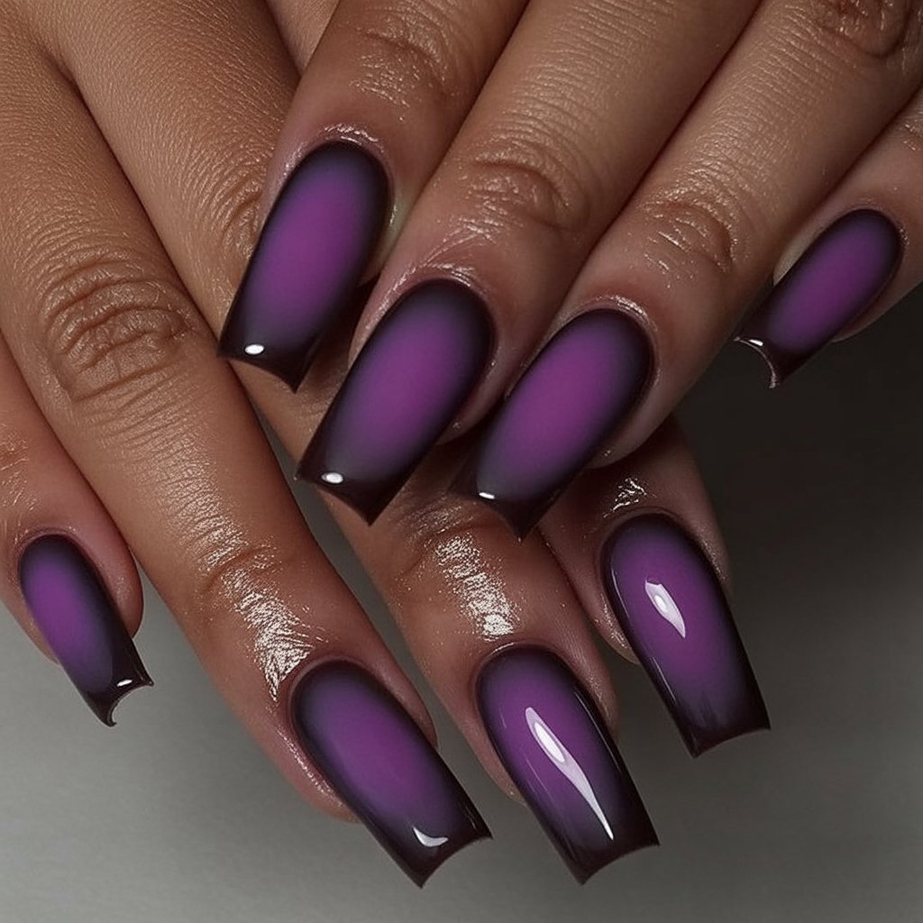 Dark plum at the base fading into soft purple at the tips gives this manicure an elegant ombre effect that feels rich and moody. It’s understated but unforgettable, like a glass of red wine in low lighting.
