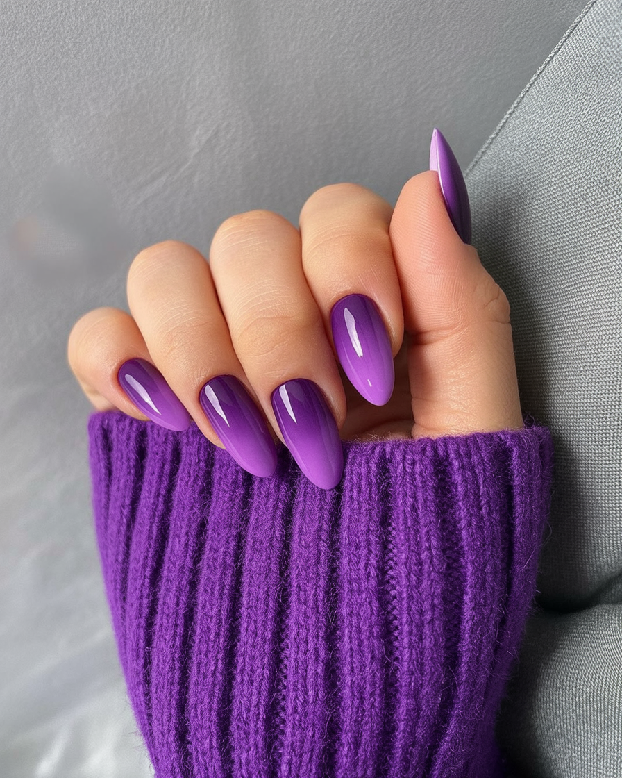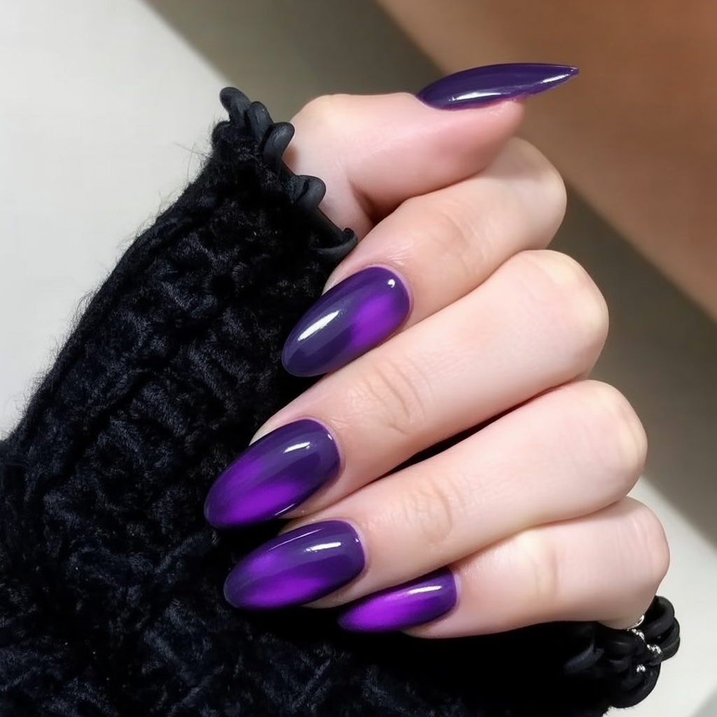 Mandatory of any purple-themed kitsch are some ombre nails that show pure artistry and drama. Starting at a soft lavender base that fades into deep midnight tips with that moody yet polished ambiance, the end result is edgy but not loud-a perfect mix between trendy and timeless.