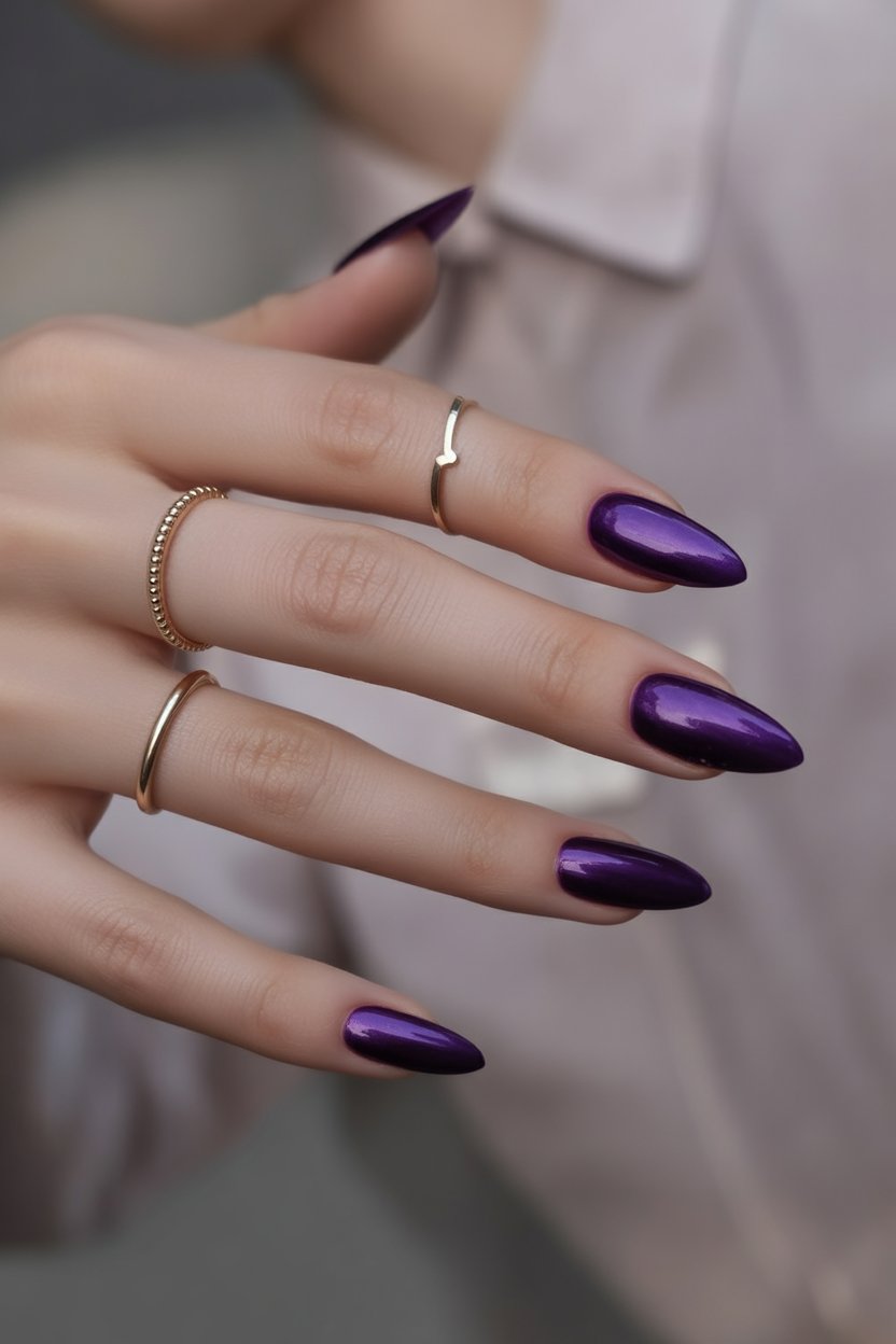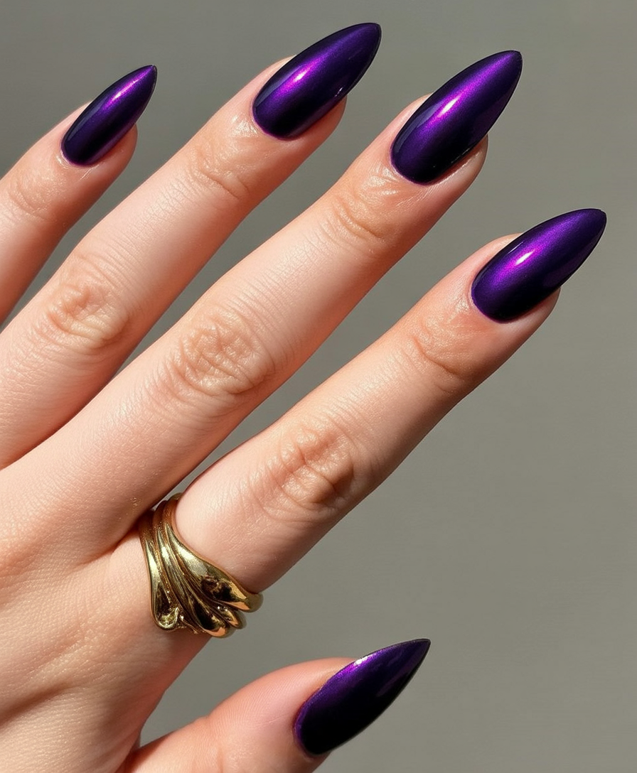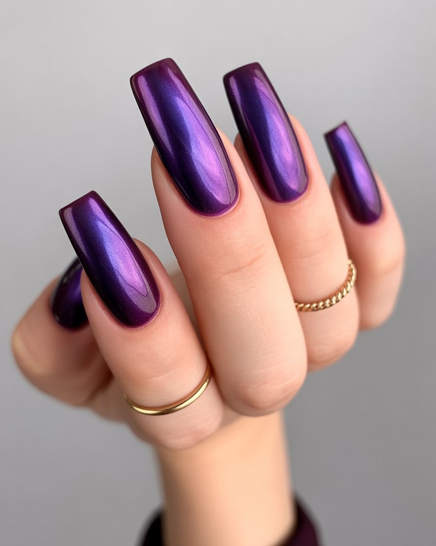This glow really makes for the chic finish that looks very classy on the hand. The deep metallic purple catches every shade in the light, moving from berry to midnight depending on the angle. It carries a certain timelessness but quite a modern feel.