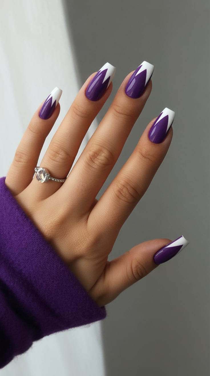 A play on the traditional French tip, with its soft curves replaced by much sharper, jagged, zigzag peaks, giving the entire manicure an edge towards modernity and fashion. The deep purple and clean white contrast feels bold yet clean, like something a runway model luringly holding an espresso would sport. It had just the right mix of fun and classy elegance.