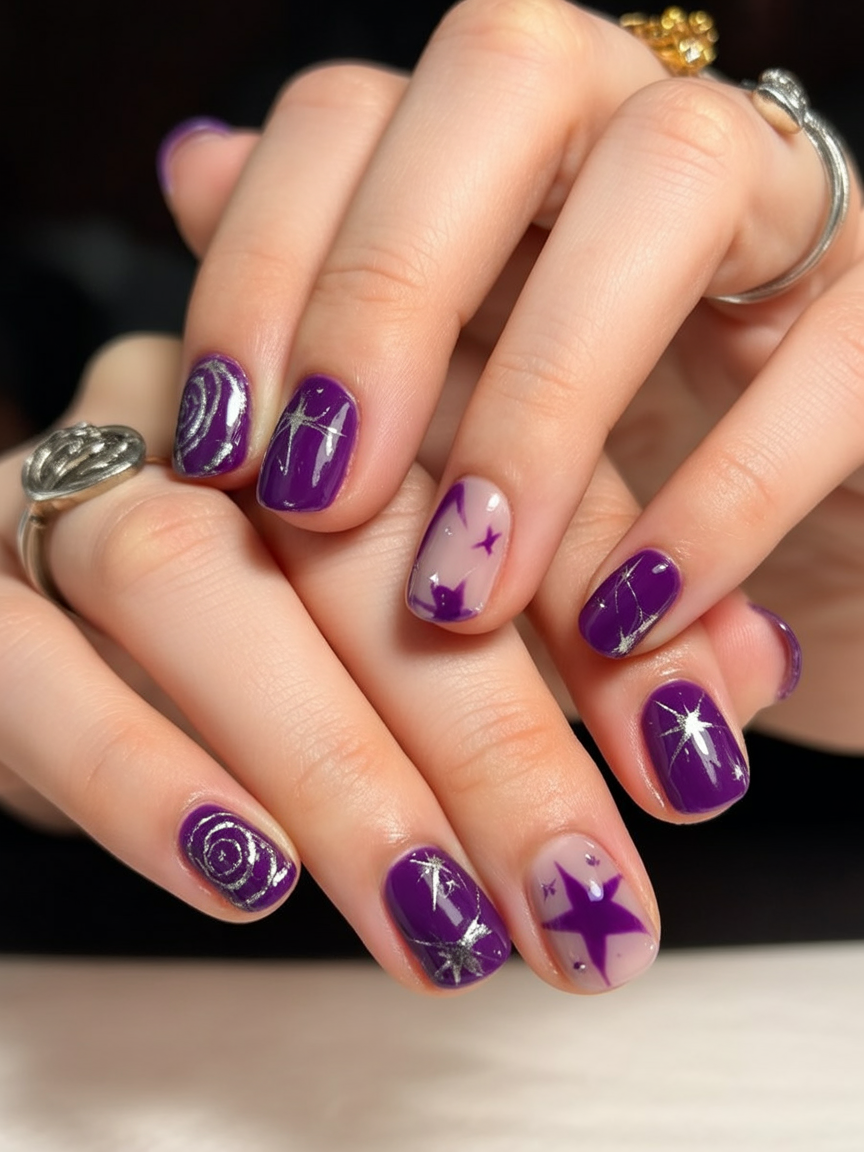 These nails feel like tiny constellations across your fingertips-deep purple with starry accents of silver and lavender. Each one is just a bit different, so it feels like a set that was actually curated instead of just a one-note design. It has this mystic yet very modern feeling to it.