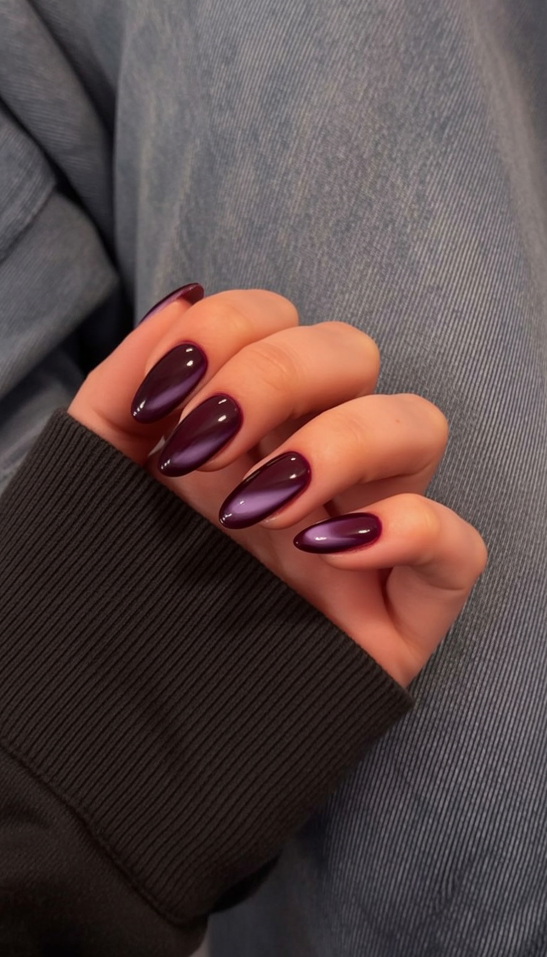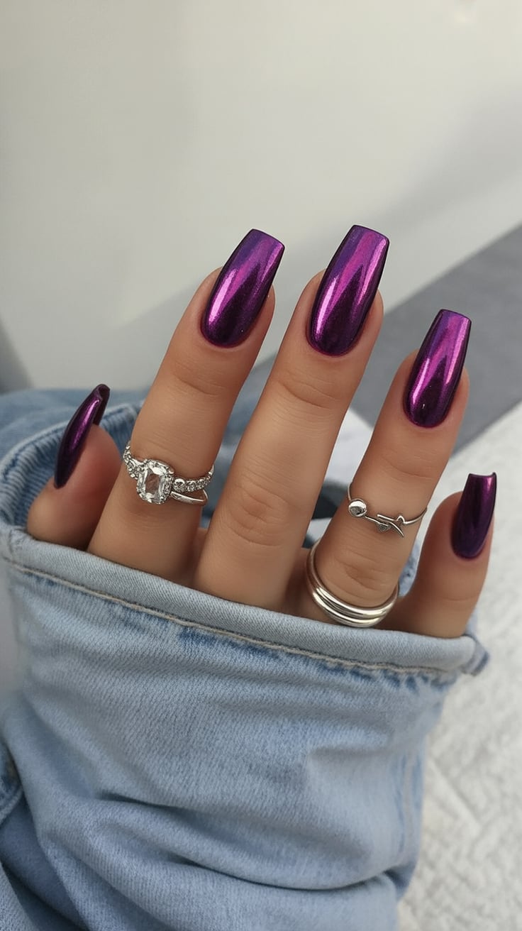 These metallic purple nails look like polished chrome—glossy, reflective, and absolutely impossible to ignore. They give off that “main character energy,” instantly elevating your entire vibe. Whether you’re wrapped in cozy sweaters or dressed up for a night out, these nails turn every gesture into a statement.