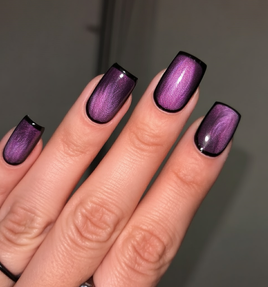 The shimmering cat-eye effect atop deep purple is like liquid magic, while the sharp square tips lend an edginess that is so modern. Black French edges place these nails somewhere between cosmic mystery and urban chic. These are playful yet polished, offering that extra something to the otherwise straightforward purple manicure.