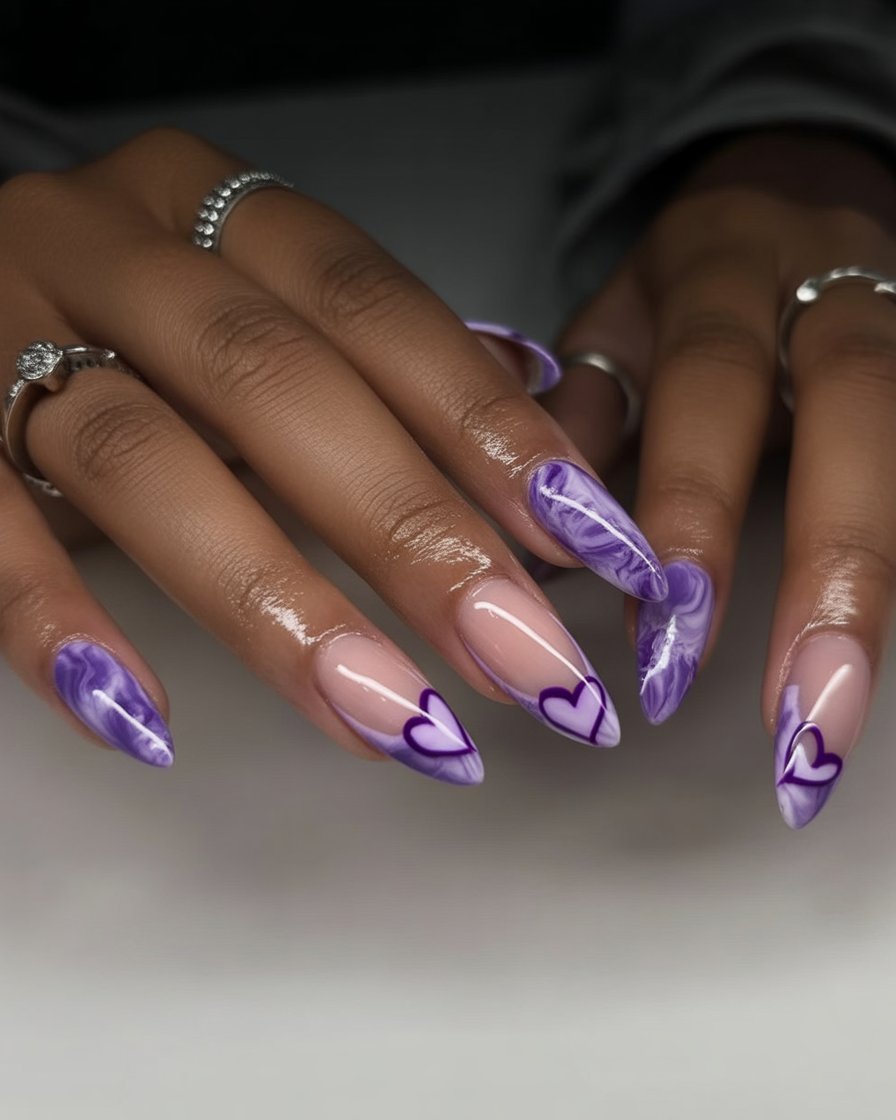 Sweet yet stiffly polished is a dreamy combination of marble swirls with heart-shaped French tips. This blend of soft neutrals with bright purples makes it romantic without childish tones-more poetic than playful. Prosthetic design that would bring a grin every time you caught a glimpse in the mirror.