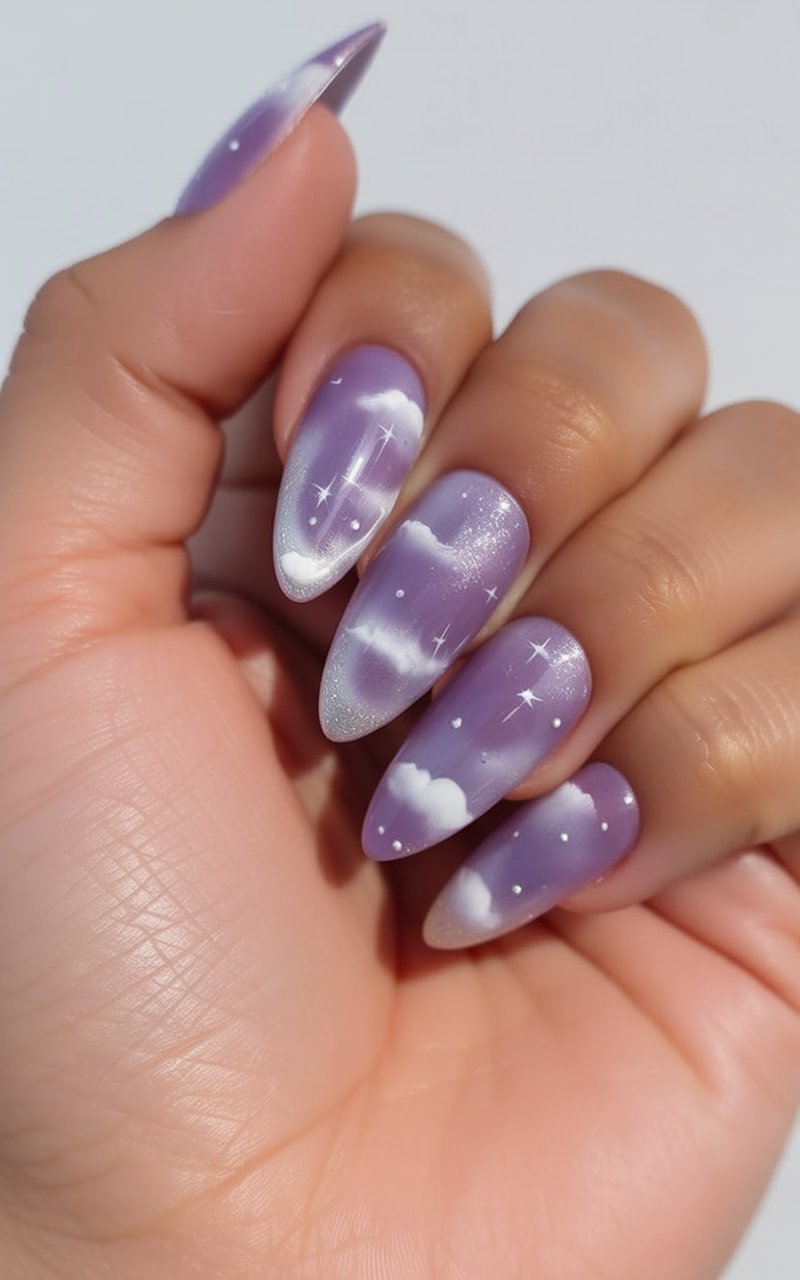 These dreamy-nails look like an artist took his fingertips and dipped them into a twilight sky. Soft-lavender backgrounds with delicate white clouds and twinkling stars create a vibe of fanciful serenity. It is an art at the nails that tells a story, giving you a piece of magic in the palm of your hand.