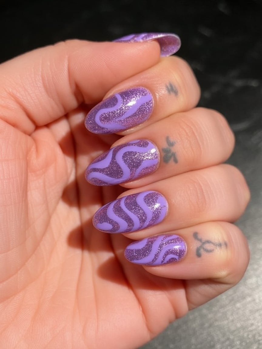 For a crazy look, the pastel lavender swirls bear a big grin on your face every time you look down at your hands. Glittery purple with fun curvy lines keeps the vibe lighthearted and modern, that small reminder that beauty doesn’t always have to be so serious. This manicure has an attitude-fun, fresh, and full of inspo.
