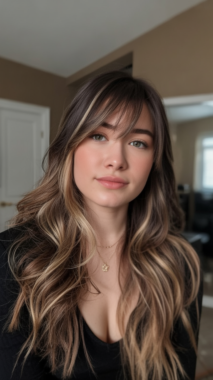 This style is perfect for straight hair or body wave textures if you want a look that floats instead of feeling too “done.” A middle part or side part both work beautifully here, and it’s such an easy option for summer when you want something cute, flattering, and low-maintenance. Just a round brush and a quick blow-dry is all it takes to finesse those bangs into place.