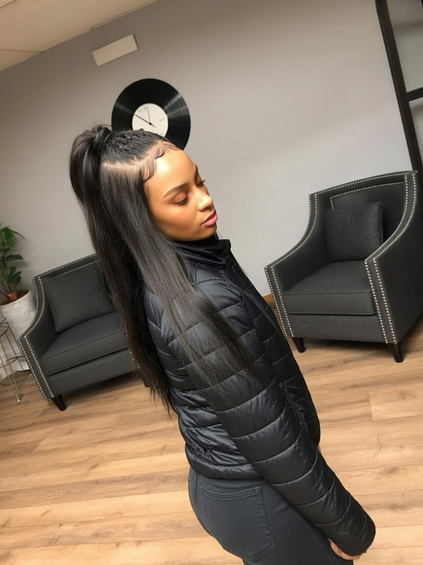 Polished at the top, party down the back—this half-up, half-down ponytail nails the balance of sleek and feminine. The crown is smoothed to mirror glass, while the lengths pour into silky straight hair that swishes when you walk. It’s the look you grab for brunch, date night, or any moment you want a little height at the front and a lot of swing behind. Emotional payoff. There’s an instant confidence boost when you feel that ponytail move—you look taller, your jawline pops, and everything reads intentional. Choose a closure to protect your weave and keep the blend pristine, then outline the pony with a small wrapped strand for a pro finish. A dot of edge control along the hairline keeps it neat from morning to last call.