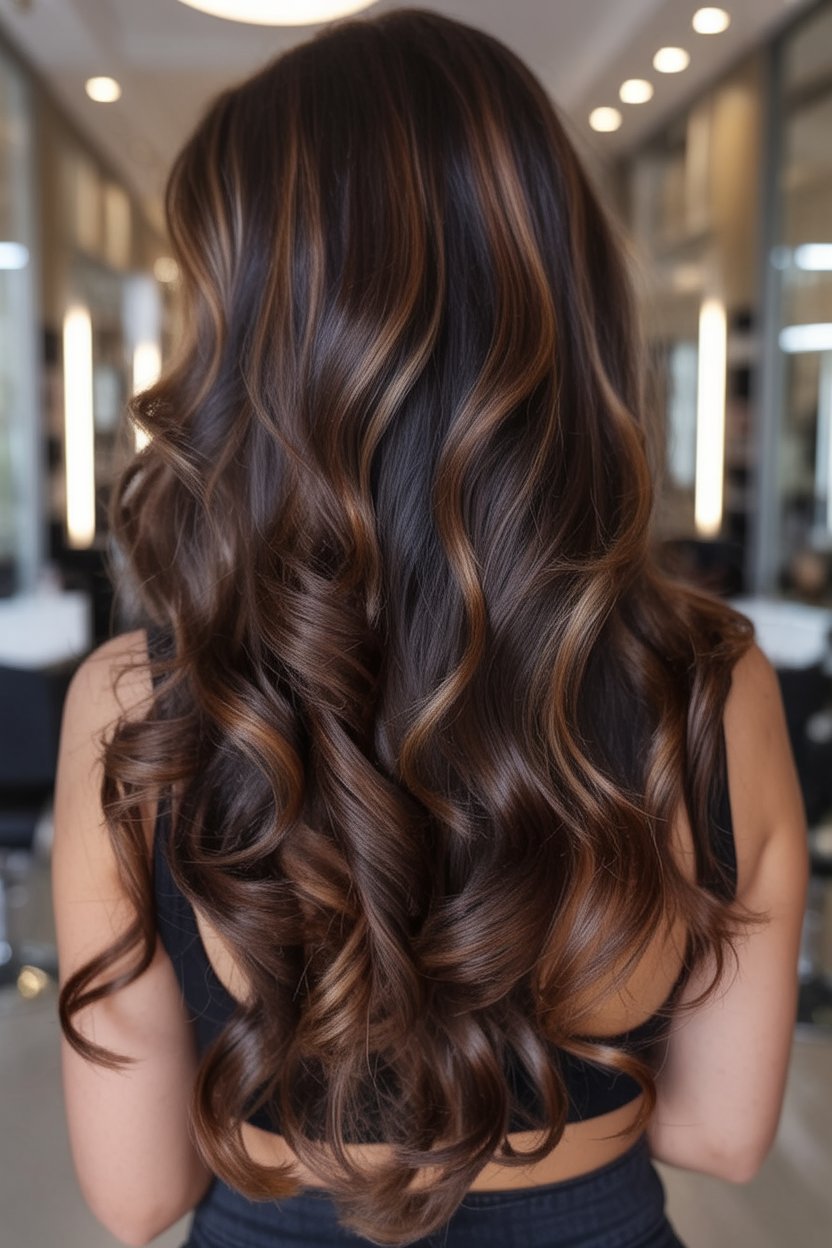 Cascading body wave ripples in rich brunette tones, brightened with café highlights that glint as you turn. This is luxe, cinematic hair—fluid, glossy, and endlessly swishable. The length feels indulgent yet wearable, a perfect canvas for soft curls or a loose braid on casual days. It’s the kind of quick weave that makes even jeans and a tank look elevated. What to wear it with. Light up warm neutrals as the base of your outfit to match the highlighted hair—think caramel blush, gold hoops, and a creamy nude lip. An evening side part adds drama; a daytime middle part feels fresh. A large curling wand is perfect for quick-fix bends, and a light oil added to the ends provides a shine. Effortless, long, and beautifully modern.