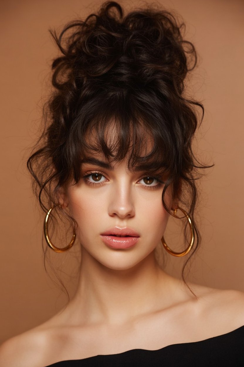 Thinking drama? This curly updo brings it in the most elegant way. The curls are full, fluffy, and beautifully romantic, while the fringe softens the look and keeps it from feeling overly formal. It’s the hairstyle you choose when you want compliments—and lots of them.