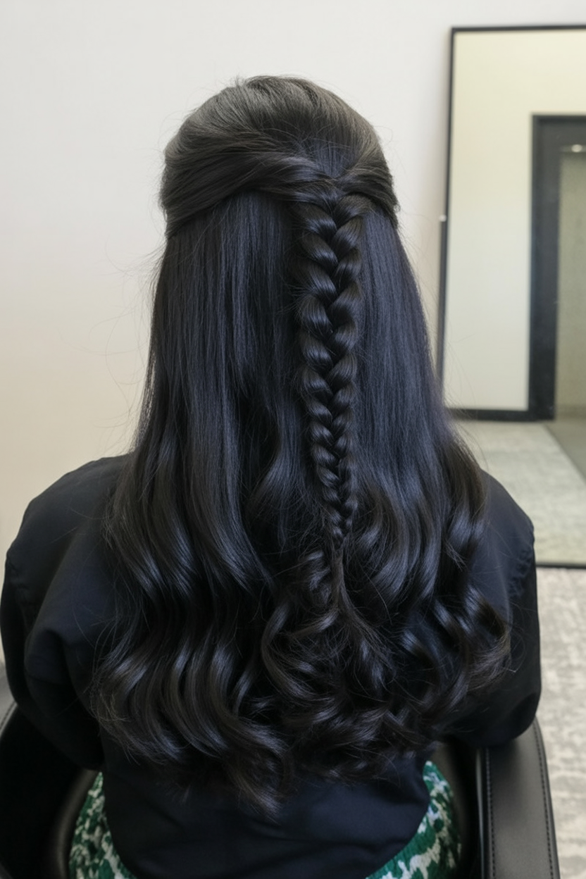 Half-up, half-down hairstyles always carry that flirty energy—and this braided version brings extra personality. The topknot adds height, while the braids bring texture and creativity, and then the loose wavy pieces soften the style beautifully. It’s playful but still perfectly polished.