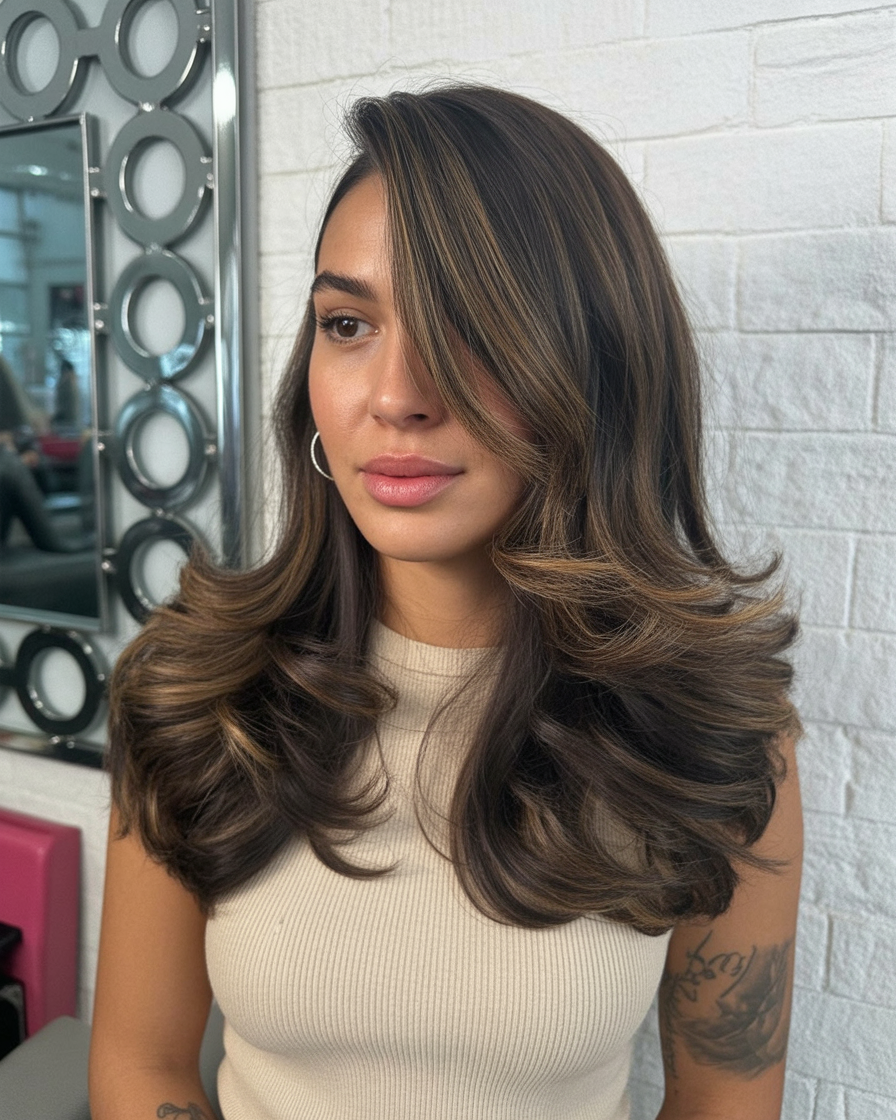These layers create that desired salon bounce, which lasts all week long. The side part opens and highlights the cheekbones, while the ends softly move and flip. It is relaxing, having the best blowout, and even more, it is a gorgeous way to frame the eyes without the heavy bangs. Low-maintenance angle. While getting dressed, roll the crown in two jumbo rollers to preserve volume, then release and finger-comb. This shape can be easily attained and maintained, and the body wave or straight bundles hold this shape with minimal heat. It is easy to refresh on busy mornings and perfect for summer when you want to hold your style with little to no effort.
