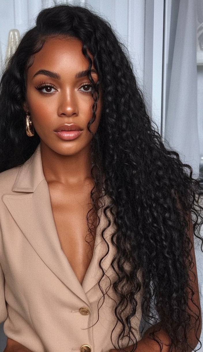 Long and luxurious—this deep wave look is pure drama in the best way. The curls frame the face like soft ribbons, and the length gives you the freedom to style however you want: swept to the side, pulled back, or worn proudly down your back.