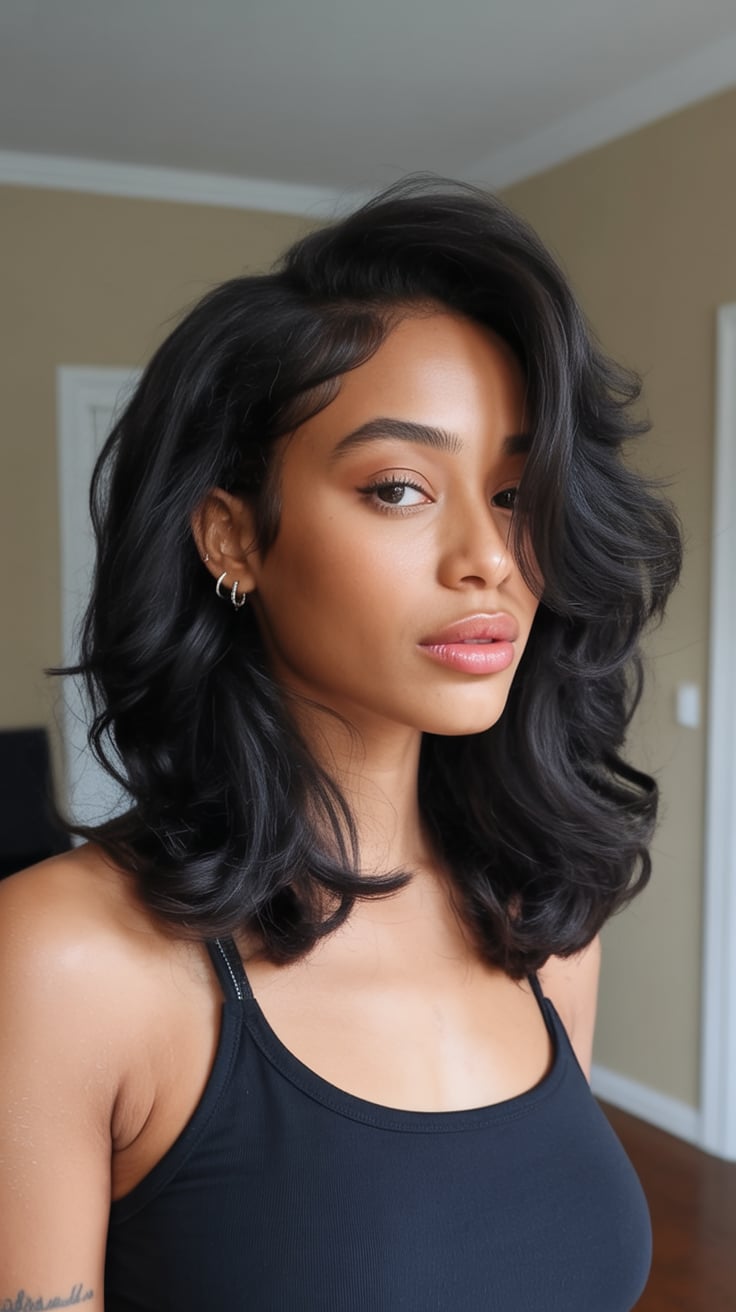 This bouncy shoulder-length quick weave serves soft glamour with a confident tilt of the chin. The side part sweeps across the forehead like silk, creating instant lift and that flirty eye-skimming veil everyone loves. Layers are carved to flip and curve, so even the slightest head turn releases airy movement. It’s sophisticated without trying too hard, the kind of everyday pretty that slips from desk to dinner and still looks fresh. Paired with glowing skin and tiny hoops, it reads modern, polished, and just a touch dramatic—in the best way. Who it’s for. This look flatteringly frames oval, round, and heart faces, and it’s a win if you crave volume with control. Choose body wave or straight hair bundles for the base, then set with a large-barrel hot tool to form those rounded ends. A side-part lace closure keeps the blend seamless for Black women who want minimal leave-out, while a light serum adds sheen without weight. If you prefer more lift, pop in Velcro rollers at the crown while you finish makeup—quick, easy, and so cute.
