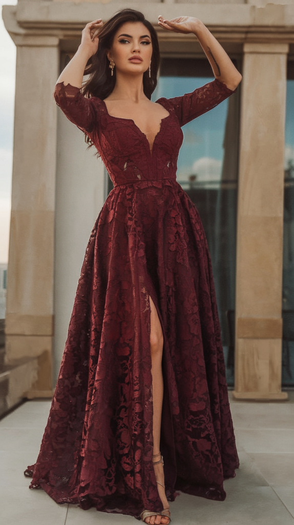 Nothing says elegance like a burgundy lace gown. The deep V-neck, long sleeves, and flowing skirt create an ethereal, romantic aesthetic, making it an ideal choice for a wedding guest outfit, prom, or an engagement party.