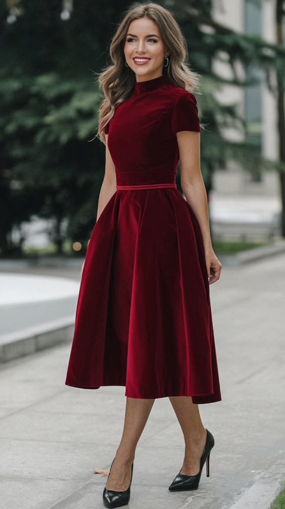 A velvet red dress is the ultimate winter fashion statement. This high-neck midi design exudes elegance, making it a perfect fit for formal office parties, Christmas events, or New Year’s Eve celebrations. The rich texture adds depth, while the structured waistline enhances the silhouette.