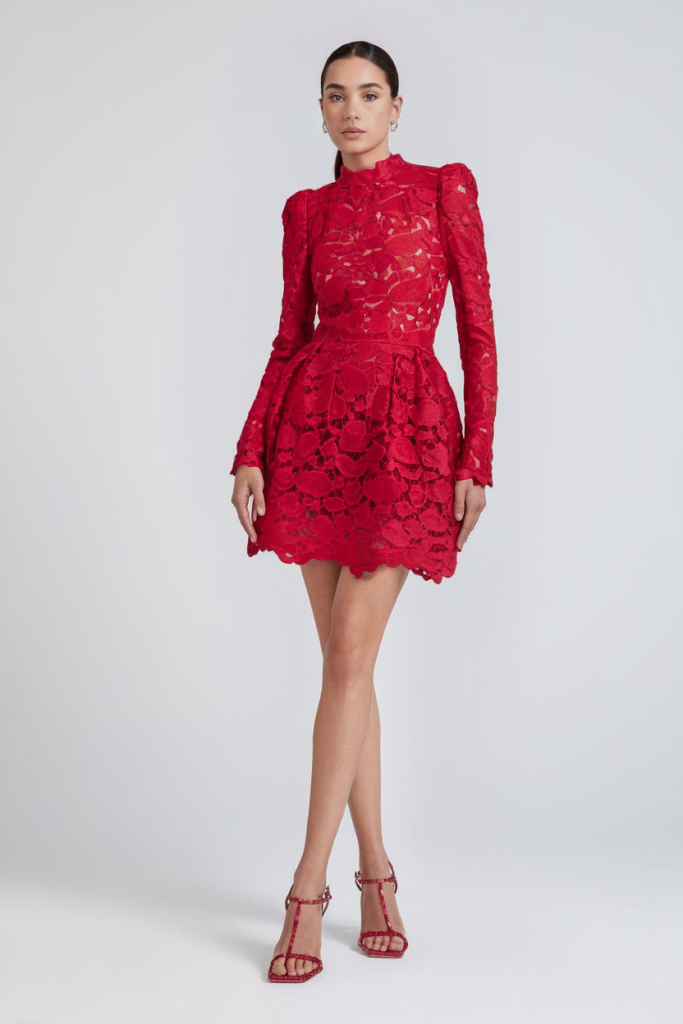 A lace red dress is the perfect fusion of sensuality and elegance. This high-neck, long-sleeve mini dress balances modesty with allure, featuring a delicate mesh lace overlay that adds texture and depth. The fitted waist and structured skirt create a flattering silhouette, making this an excellent choice for a birthday party, cocktail night, or even a Halloween masquerade ball.