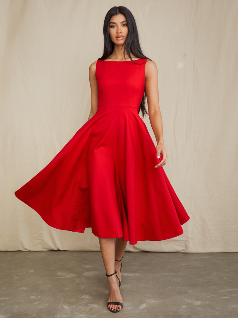 A square neckline brings a contemporary twist to the classic red dress, making it ideal for wedding guest attire or an elegant formal occasion. The structured bodice and flowing skirt balance femininity with minimalism, creating a versatile look.