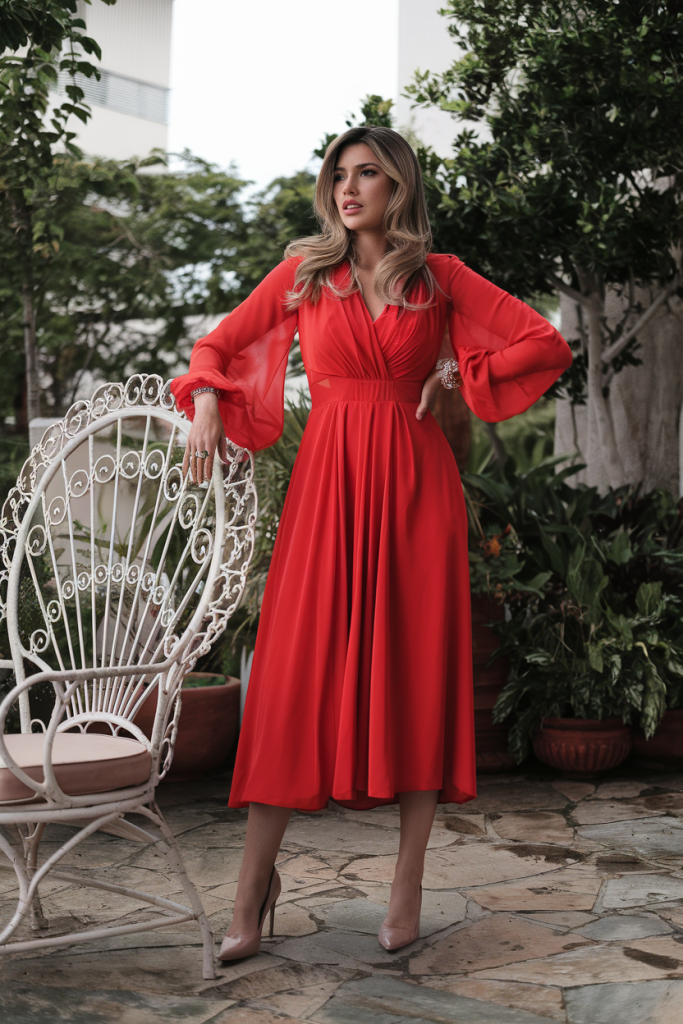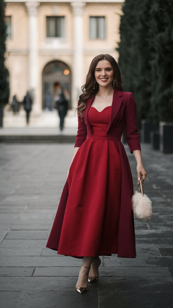 Layering is key in seasonal fashion, and this red midi dress with a tailored blazer is a masterclass in elegance and practicality. The structured blazer adds a formal touch to the sweetheart neckline, making it perfect for wedding guest attire or a business casual event. The full skirt enhances movement, adding a touch of drama to every step.