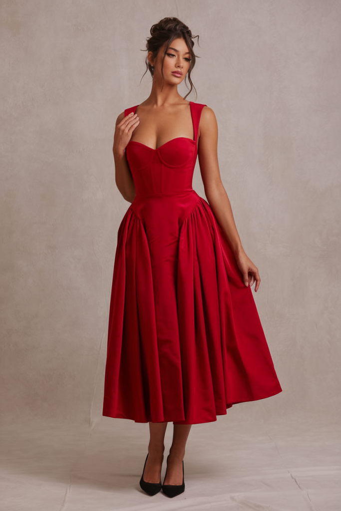 A structured corset dress in red instantly radiates night elegant appeal. The sculpted bodice provides an ultra-feminine silhouette, making it perfect for prom, a Christmas party, or a formal wedding. The velvet finish adds depth and dimension, while the structured pleats create movement.
