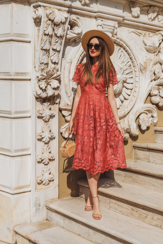 Lace adds a romantic, vintage touch to any outfit, making this red dress an excellent choice for spring and summer occasions. The fitted bodice and flowing skirt create a flattering silhouette, while the delicate lace fabric adds aesthetic charm.