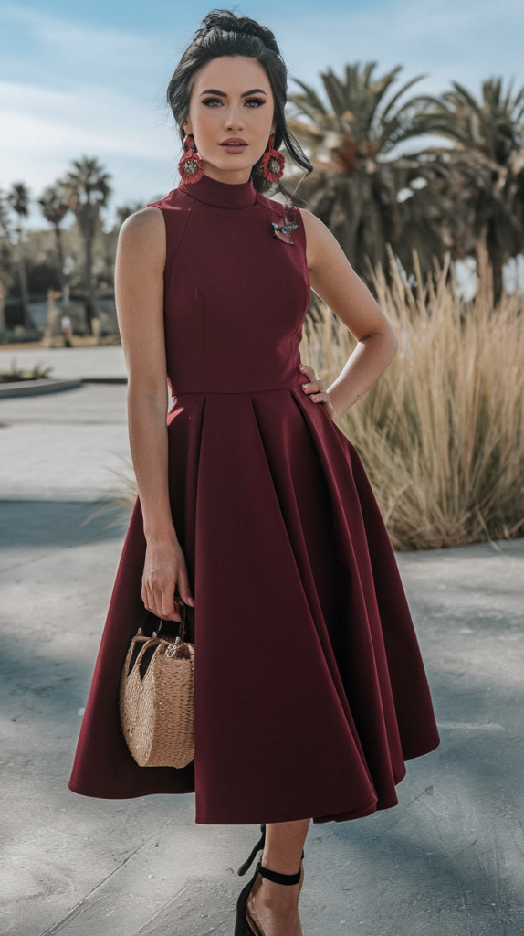For a winter take, layer with a wool coat and opt for suede or leather boots to add texture while keeping warm. A burgundy clutch complements the tone beautifully.