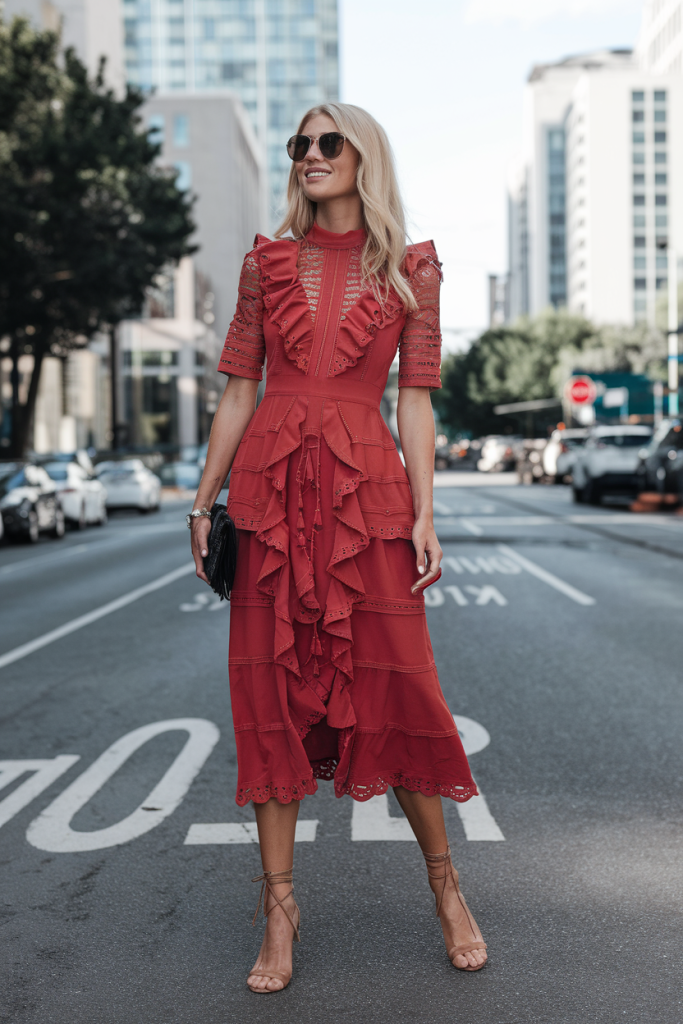 For a modern and trendy aesthetic, this ruffled lace midi dress is a standout. Featuring intricate detailing, structured sleeves, and cascading ruffles, this design exudes sophistication. Perfect for a day-to-night transition, it works effortlessly for casual outings, a birthday brunch, or an elegant party night.