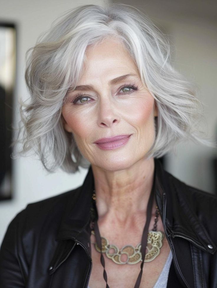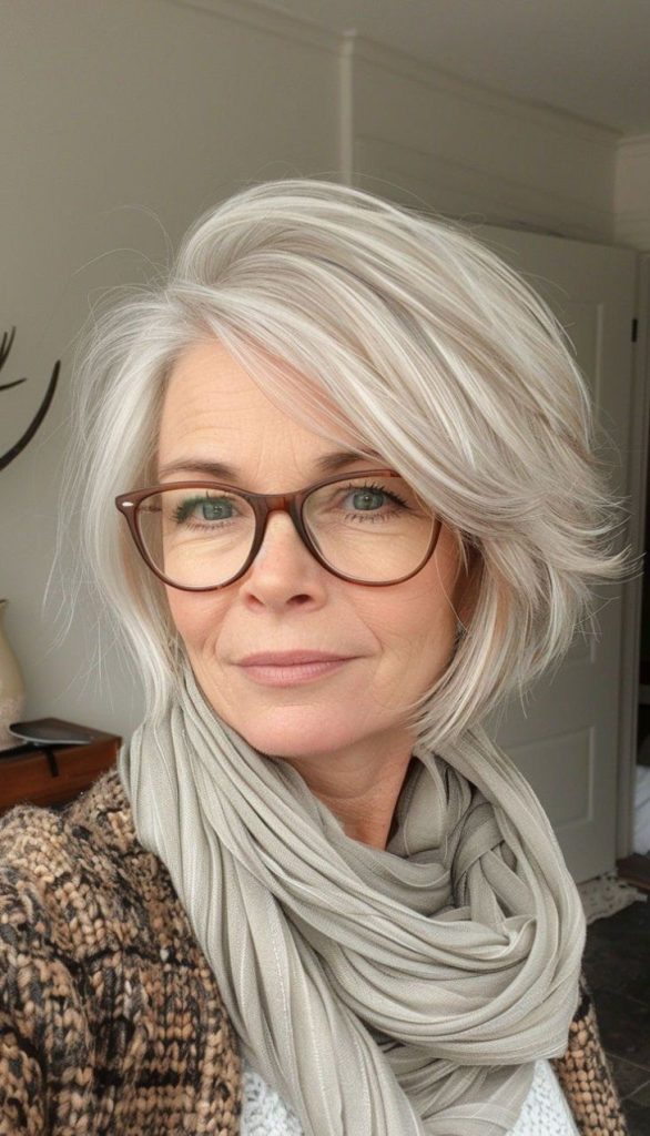 The silver bob is a timeless choice that never goes out of style. Paired with glasses, this look highlights your facial features and creates a polished, intellectual vibe. The slightly layered ends give the bob a soft finish, perfect for women with medium-length or thick hair looking to add movement and dimension.