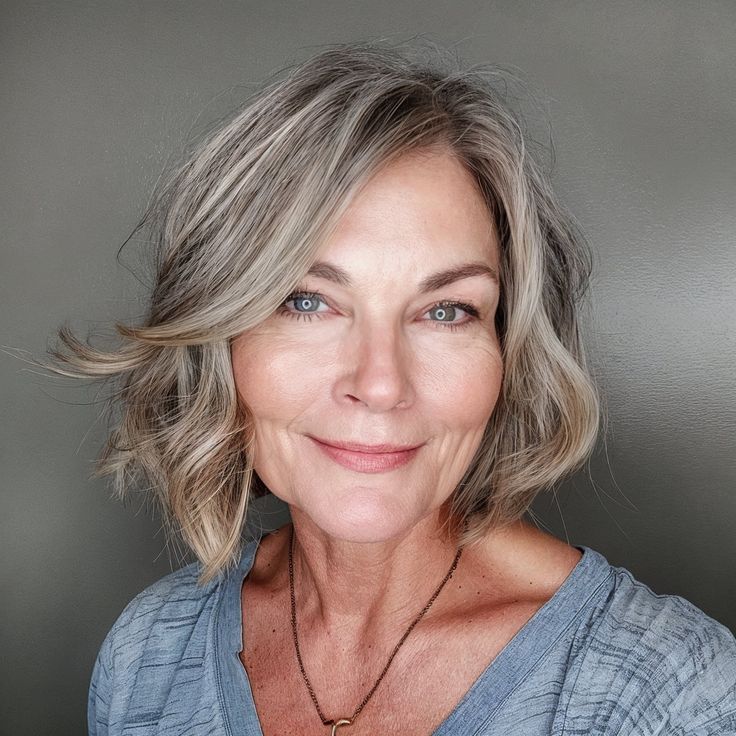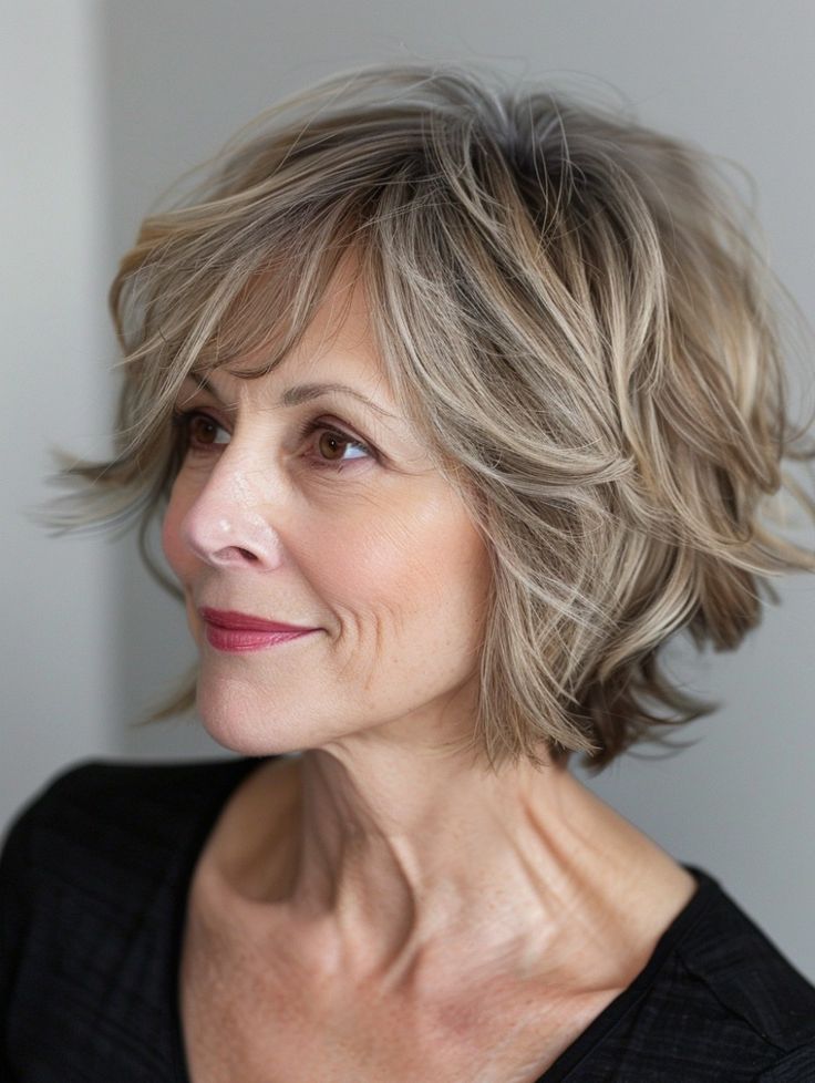 This voluminous layered bob with a side part is a sophisticated choice for women over 60. The layers add body and movement, making it a perfect fit for thick wavy hair. The side part gives the style a soft, asymmetrical look, drawing attention to your eyes and cheekbones. This is one of the best options for those who want a polished yet approachable appearance.