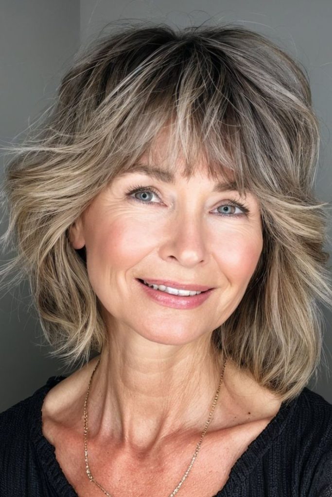 This soft layered bob is a timeless look, perfect for women over 60 who want an effortlessly chic appearance. The side-swept bangs frame the face beautifully, adding softness while drawing attention to the cheekbones. Ideal for those with fine hair, this cut provides the illusion of volume without being overwhelming. The layers add dimension, making it a great choice for round faces and women with thinning hair who want to maintain a youthful glow.